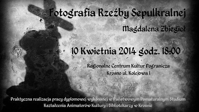 W czwartek (10.04) o godz. 18.00 w Regionalnym Centrum Kultur Pogranicza w Krośnie (ul. Kolejowa1) odbędzie się praktyczna realizacja pracy dyplomowej Magdaleny Zbiegieł, słuchaczki II roku Fotografii w Państwowym Pomaturalnym Studium Kształcenia Animatorów Kultury i Bibliotekarzy w Krośnie. Wystawa połączona będzie ze spektaklem „Isadora” – praktyczną realizacją pracy dyplomowej Eweliny Ferlejko. – Jest to zbiór fotografii przedstawiających rzeźby cmantarne. Zapraszam na wernisaż i mam nadzieję, że dzięki tej wystawie spojrzą Państwo inaczej na przestrzeń cmentarną – mówi autorka Magdalena Zbiegieł.