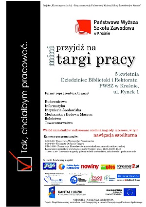 5 kwietnia 2011 r. na dziedzińcu Biblioteki i Rektoratu Państwowej Wyższej Szkole Zawodowej w Krośnie (ul. Rynek 1) w godzinach od 8.30 do 14.30 odbywać się będą „Targi Pracy” realizowane w ramach projektu rozwoju Państwowej Wyższej Szkoły Zawodowej w Krośnie „Kurs na Gospodarkę”.
