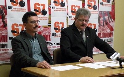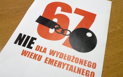 „Przeciw 67” Podczas konferencji prasowej Tadeusz Majchrowicz przedstawił argumenty przeciw podniesieniu wieku emerytalnego. Jego zdaniem ta zmiana nie rozwiązuje problemów, za to spowoduje nowe. – Pamiętajmy, że w Polsce na 100 aktywnych zawodowo, 12 jest bezrobotnymi – podkreślał T. Majchrowicz – młodzi ludzie nie mają szans na zatrudnienie. Podniesienie wieku emerytalnego pogorszy sytuację ludzi młodych. Wśród pozostających bez pracy prawie 30% to osoby w wieku 25-34 lata. 21% nie przekroczyło 24 roku życia – przedstawiał dane nt. bezrobocia. Następnie dodał, że proponowane przez rząd zmiany skazują na zasiłki i pomoc społeczną osoby o długim stażu pracy – Mówiąc wprost, naszym zdaniem jest to niehumanitarne, żeby w wieku 67 lat ludzie wykonywali niektóre zawody. Jest ich bardzo wiele – T. Majchrowicz wymieniał pielęgniarki, pomocową w Krośnieńskich Hutach Szkła, która odnosi szkło od hutnika czy osoby obsługujące ruch lotniczy..