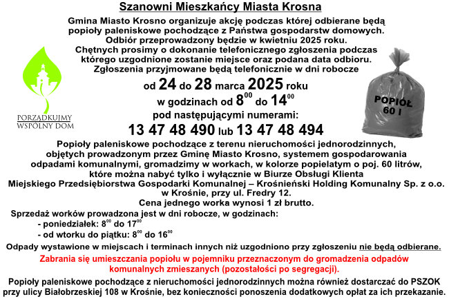Gdzie? Odbiór będzie realizowany z nieruchomości znajdujących się na terenie miasta Krosna. Popioły paleniskowe należy wystawić w workach, w kolorze popielatym o poj. 60 litrów.