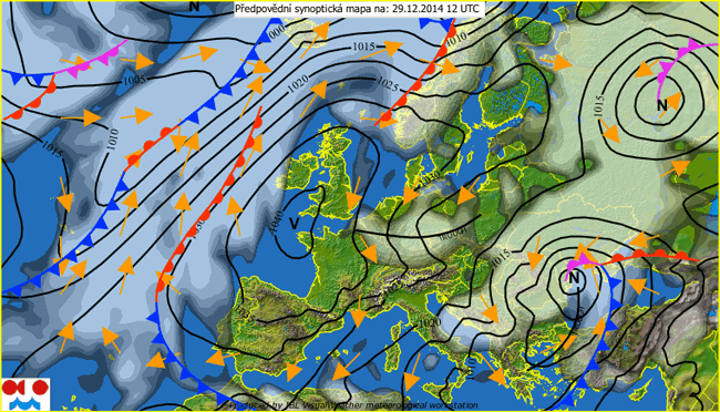 W nocy z niedzieli na poniedziałek znajdziemy się w obszarze przejściowym pomiędzy silnym wyżem przemieszczającym się znad Irlandii nad Morze Celtyckie a niżem znad Bałkanów. Z północy napływać będzie zimne powietrze arktyczne. Zachmurzenie duże z niewielkimi przejaśnieniami, słabe opady śniegu. Temperatura minimalna od -9 °C do -8 °C. Wiatr słaby i umiarkowany, północny i północno-zachodni. Widzialność umiarkowana i dobra, od 6 km do 15 km. Ciśnienie zredukowane do poziomu morza wyniesie o północy 1021 hPa i będzie powoli wzrastać.