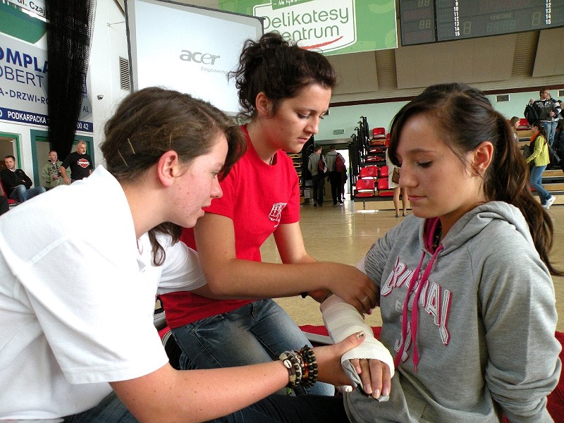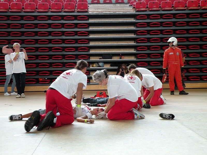 Na licznych stanowiskach urazowych wolontariusze prezentowali udzielanie pierwszej pomocy w różnych przypadkach, nie tylko tych, które mogą nastąpić na drodze. Zachęcali do ćwiczeń, pierwszych 100 osób, które podjęło to wyzwanie otrzymało niewielkie, podręczne apteczki pierwszej pomocy oraz odblaskowe opaski z podstawowymi informacjami o udzielaniu pomocy ofiarom wypadku. Rozdawano również maseczki do prowadzenia sztucznego oddychania. Uczestnicy warsztatów mogli się zapoznać z profesjonalnym strojem ochronnym motocyklisty i z wyposażeniem samochodu wyścigowego. Zaprezentowano symulator zderzeń czołowych przygotowany przez Instytut Transportu Samochodowego w Warszawie. Urządzenie to pozwala odczuć efekt zderzenia czołowego przy prędkości zaledwie 5-7 km/godzinę. – Większa prędkość mogłaby już być zbyt niebezpieczna – tłumaczono.