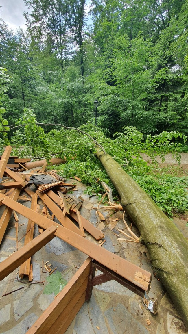 – Na nową altanę w rejonie Bełkotki spadło drzewo, którego kondycja zdrowotna nie budziła dotychczas żadnych zastrzeżeń. Do powstania wywrotu przyczyniły się prawdopodobnie intensywne opady deszczu, które spowodowały podmycie systemu korzeniowego drzewa i jego osłabienie – informuje na Facebooku KWW „Nasza Przyszłość” Gmina Iwonicz-Zdrój.