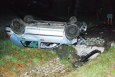 Pierwszy z samochodów dachował na ul. Rzeszowskiej w Krośnie w nocy, kilkanaście minut przed godz. 4. Jak ustalili policjanci vw golf poruszał się w kierunku skrzyżowania z Al. Jana Pawła II, za jego kierownicą siedział 21-letni mieszkaniec gminy Rymanów, zaś pasażerką auta była 25-letnia kobieta. Mężczyzna utrzymuje, że wjechał do rowu, aby uniknąć zderzenia z jadącym w przeciwnym kierunku samochodem nieznanej marki. W następstwie wypadku 21-latek doznał złamania ręki, zaś kobieta ogólnych potłuczeń.