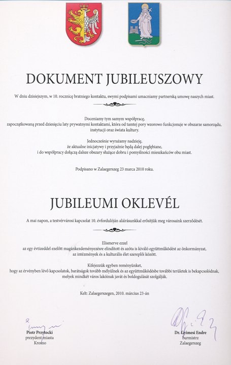 Po głównych uroczystościach w Budapeszcie krośnieńska delegacja udała się do partnerskiego miasta Zalaegerszeg, gdzie kontynuowane były obchody Dnia Przyjaźni. Spotkanie w Zalaegerszeg miało dodatkowo charakter jubileuszowy. Dokładnie 10 lat wcześniej dzięki podpisaniu umowy partnerskiej rozpoczęła się owocna współpraca pomiędzy Krosnem a Zalaegerszeg.