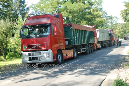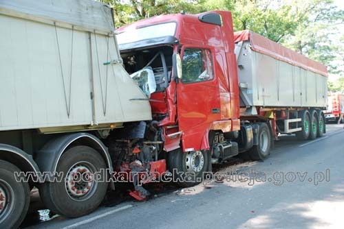 Przez kilka godzin trwały utrudnienia w ruchu na drodze łączącej Duklę z Nowym Żmigrodem. Rano zderzyły się tam trzy ciężarówki z tej samej firmy transportowej, a odłamki uszkodziły jeszcze przejeżdżającego obok seata. Dwie osoby zostały przewiezione do szpitala.