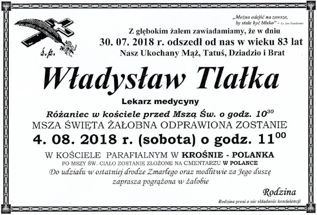 30 lipca zmarł zasłużony lekarz, samorządowiec i działacz społeczny Władysław Tlałka. Miał 83 lata. Pogrzeb odbędzie się w sobotę, 4 sierpnia na cmentarzu w Polance.