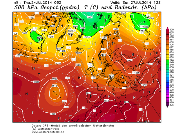 W niedzielę w ciągu dnia będziemy w cyrkulacji południowej obojętnej, pomiędzy wyżem znad Rosji a niżem znad wschodnich Niemiec i związanego z nim pofalowanego frontu atmosferycznego. Z południa napływać będzie gorące powietrze zwrotnikowe. Zachmurzenie umiarkowane i duże, możliwe przelotne opady deszczu i burze. Poza okresami z burzą na ogół słonecznie. Temperatura maksymalna od 28 °C do 29 °C. Wiatr słaby, z kierunków południowych i wschodnich. Widzialność dobra, od 10 km do 30 km. Ciśnienie zredukowane do poziomu morza wyniesie w południe 1012 hPa i będzie się nieznacznie wahać. Warunki biometeorologiczne wciąż niekorzystne.
