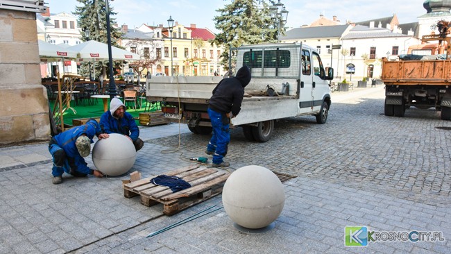 "Kierowcy nie respektowali zakazu, więc droga będzie zablokowana". Na krośnieńskim Rynku montowane są betonowe kule, które uniemożliwią przejazd przez płytę.