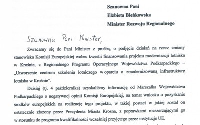 Posłowie nagłaśniają temat, apelują o działanie W sprawie zagrożonej dotacji interweniowali lokalni posłowie z Sejmowej Komisji Infrastruktury: Piotr Babinetz i Bogdan Rzońca (obaj z PiS). O tym, że Krosno prawdopodobnie nie otrzyma dofinansowania, dowiedzieli się 4 października. Dzień później nagłośnili temat w mediach: Rozbudowa lotniska bez dofinansowania. Równolegle zwrócili się pisemnie o pomoc, między innymi do Ministerstwa Rozwoju Regionalnego.