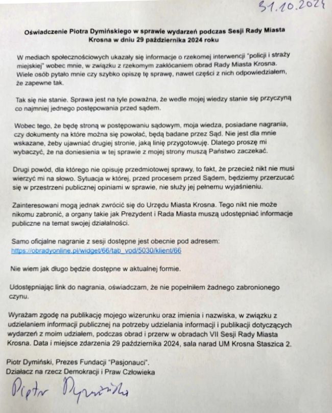 Publikujemy oświadczenie Piotra Dymińskiego w sprawie wydarzeń podczas Sesji Rady Miasta Krosna w dniu 29 października 2024 roku.