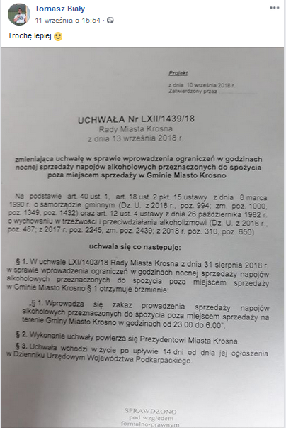 • Radni PiS to naprawdę mądrzy i wspaniali ludzie, którzy widzą problemy związane z piciem alkoholu. Codziennie na krośnieńskich portalach internetowych czyta się o nieszczęściach i ekscesach powodowanych przez pijanych. Ile tragedii drogowych powodują pijani kierowcy. Popieram całkowity zakaz sprzedaży alkoholu po 22-ej.