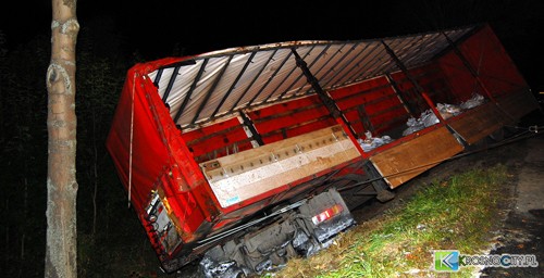 Kierowca ciężarówki odruchowo skręcił w prawo i przez ok. 30 m pchał osobówkę, po czym niszcząc barierę ochronną, zjechał na pobocze i zatrzymał się w rowie tuż przed drzewem (ciągnik siodłowy i część naczepy). Samochód pod wpływem przesunięcia się przewożonego ładunku, zaczął zsuwać się w dół, grożąc wywróceniem się pojazdu. Samochód osobowy znajdował się na poboczu po drugiej stronie drogi, a jego kierowca (39-letni mieszkaniec gm. Dukla) był uwięziony w rozbitej karoserii i nie dawał oznak życia. Lekarz z karetki pogotowia stwierdził zgon. Natomiast kierowca samochodu ciężarowego, 48-letni mieszkaniec Tarnobrzega, który o własnych siłach wyszedł z uszkodzonej kabiny, został przewieziony do szpitala przez drugą karetkę. Po przeprowadzonych badaniach powrócił na miejsce zdarzenia. Kierowca ciężarówki był trzeźwy.