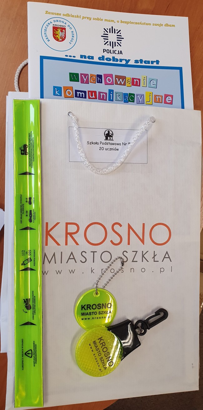 Uczniowie otrzymują pakiety gadżetów odblaskowych ufundowanych przez prezydenta Krosna – breloczki LED, zawieszki odblaskowe oraz kolorowankę edukacyjną o tematyce bezpieczeństwa w ruchu drogowym.