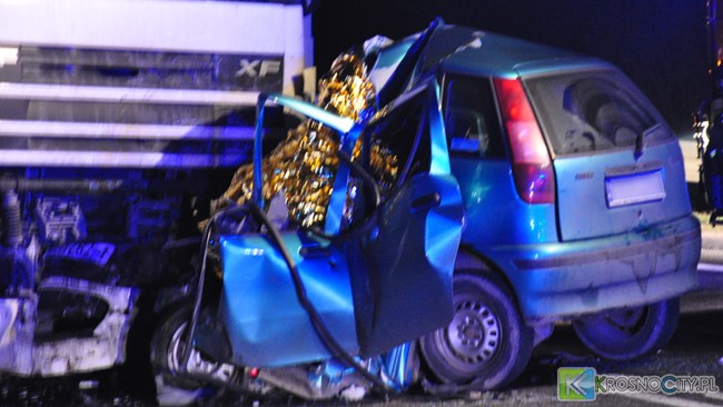 Policjanci pod nadzorem prokuratora pracują na miejscu wypadku, w którym śmierć poniosła jedna osoba. Kierujący samochodem osobowym marki Fiat Punto jadąc w kierunku Dukli w miejscowości Równe prawdopodobnie zjechał na przeciwległy pas ruchu i zderzył się z jadącym z naprzeciwka samochodem ciężarowym marki DAF, kierowanym przez obywatela Białorusi. W wyniku zderzenia śmierć na miejscu poniósł kierowca osobówki.