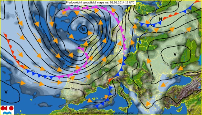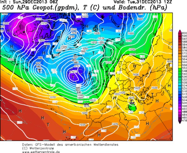 We wtorek, czyli ostatni dzień roku 2013, pozostaniemy pod wpływem wyżu znad Europy Wschodniej, z centrum nad pograniczem ukraińsko-białoruskim. Z południa zacznie napływać ciepłe i wilgotne powietrze polarno-morskie. Zachmurzenie duże z możliwością niewielkich przejaśnień, zwłaszcza w godzinach porannych. Temperatura maksymalna od 3 °C do 4 °C. Wiatr słaby, wschodni i południowo-wschodni. Widzialność umiarkowana i dobra, od 6 km do 15 km. Ciśnienie zredukowane do poziomu morza wyniesie w południe 1027 hPa i będzie powoli spadać. Warunki biometeorologiczne obojętne.