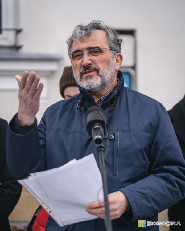– Dziś jesteśmy tu przeciwko haniebnej uchwale z 28 lutego, która w tym budynku na posiedzeniu rady miasta przeszła głosami tych ludzi, których nie interesuje czy krośnianie będą mieli gdzie zaparkować swoje auta, oni swoje auta stawiają na wydzielonych parkingach – elita może więcej. Ile oni zapłacą? ZERO. A oni dojeżdżają do tej pracy zupełnie tak samo jak tysiące innych mieszkańców Krosna i okolic. Szanowni Państwo, ja chcę przypomnieć, że to właśnie polityka pana Przytockiego, na przestrzeni ostatnich lat doprowadziła do zabetonowania rynku, do zniszczenia przedsiębiorczości w centrum miasta. To ich tanie sprzedawanie gruntów, ulgi dla marketów i galerii handlowych budowanych pod protektoratem miasta doprowadziło do wyludnienia się centrum. A dziś bezczelnie tworzą program ObudźMY Miasto. Takiej hipokryzji nie ma nawet na szczeblu krajowym. Stoimy w obronie przedsiębiorców, którzy napędzali zawsze ruch na starówce. Mówimy NIE wyganianiu mieszkańców z Rynku – mówił Kędzierski.