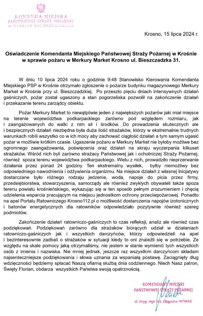 Krośnieńska Straż Pożarna wydała oświadczenie w sprawie pożaru marketu budowlanego Merkury Market przy ul. Bieszczadzkiej. 15 lipca – po pięciu dniach zakończyła się akcja gaśnicza. Poniżej prezentujemy całość oświadczenia. Pod oświadczeniem podpisał się komendant miejski PSP w Krośnie st. bryg. Zbigniew Nowak. Poniżej treść oświadczenia.