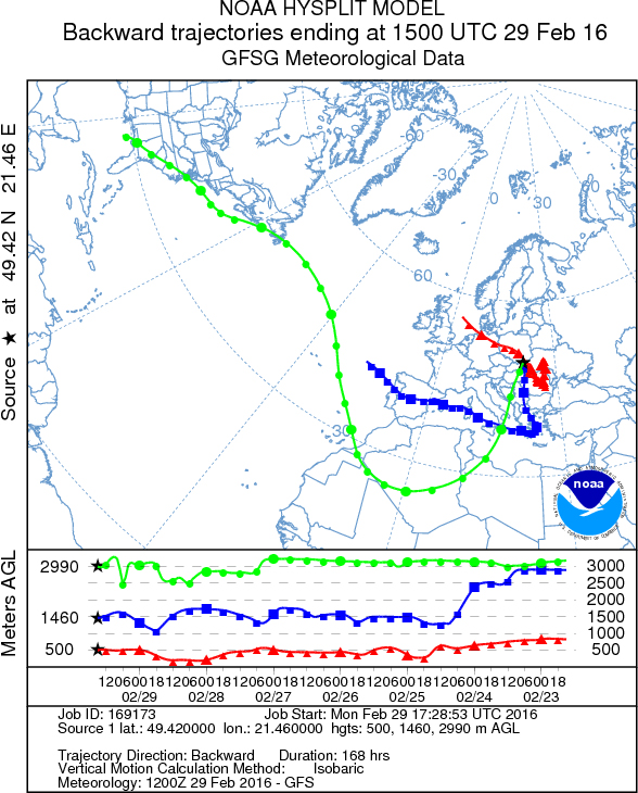 Z punktu widzenia meteorologicznego, opad deszczu i pustynnego pyłu zawdzięczamy niżowi znad Morza Śródziemnego. Zarówno Krosno, jak i całe województwo podkarpackie, znajduje się w jego ciepłym wycinku, gdzie ma miejsce napływ powietrza z dalekiego południa, a na wysokości około 3 kilometrów nad naszymi głowami… aż z Afryki Północnej. Potwierdza to poniższa grafika, na której widać skąd napływa powietrze do Krosna na wysokości 500 metrów, 1460 metrów i 2990 metrów.