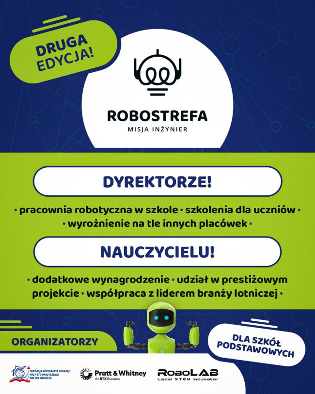 Projekt "RoboSTREFA – Misja Inżynier" jest nową inicjatywą Fundacji Wspierania Edukacji przy Stowarzyszeniu Dolina Lotnicza, realizowaną wspólnie z firmą Pratt & Whitney Rzeszów oraz RoboLAB Local STEM Incubator.