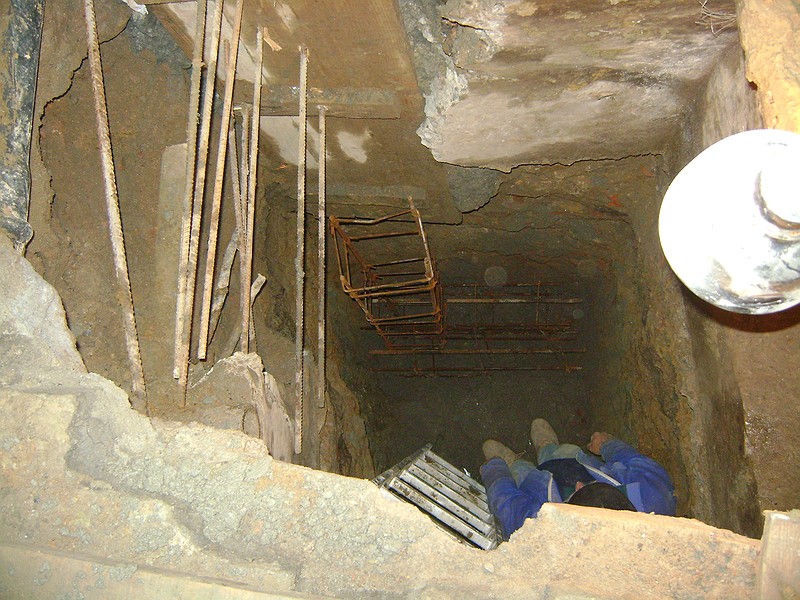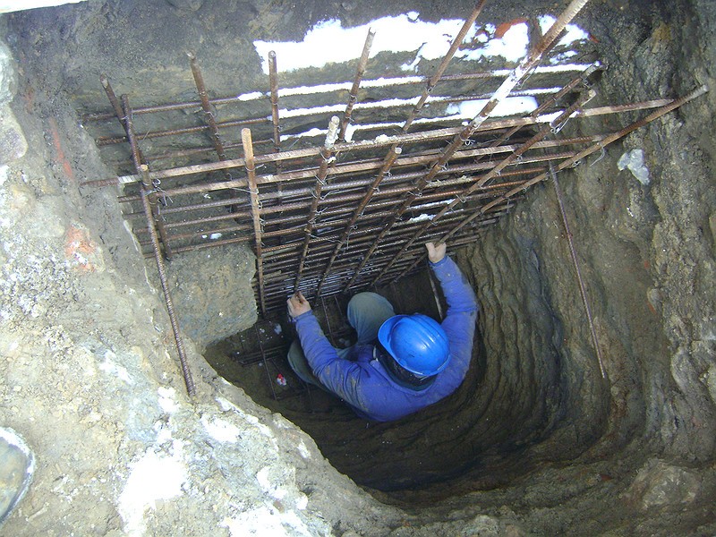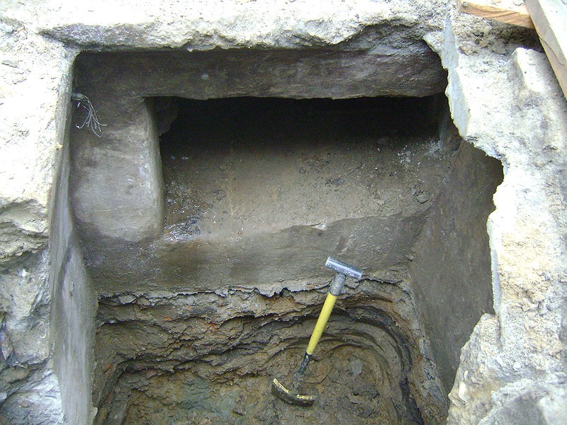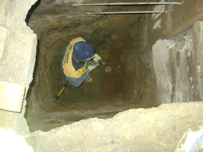 Prace przy zabezpieczeniu narożnika kamienicy. Najgłebszy wykop wykonany ręcznie miła ponad 3,5 metra głębokości.
