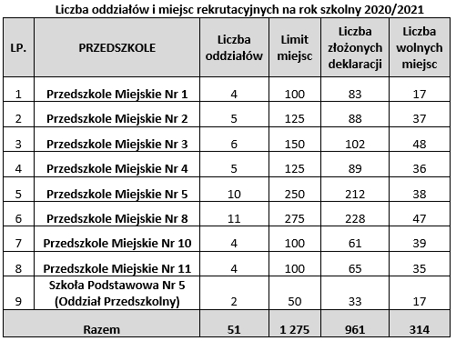 Miejskie przedszkola na nowy rok szkolny oferują 1 275 miejsc dla dzieci w wieku od 3 do 6 lat. Deklaracje o kontynuowaniu wychowania przedszkolnego w kolejnym roku szkolnym złożyło 961 rodziców przedszkolaków, co gwarantuje im miejsce w przedszkolu, do którego obecnie uczęszczają. Po zakończeniu procesu składania deklaracji, w miejskich  przedszkolach pozostało 314 wolnych miejsc.