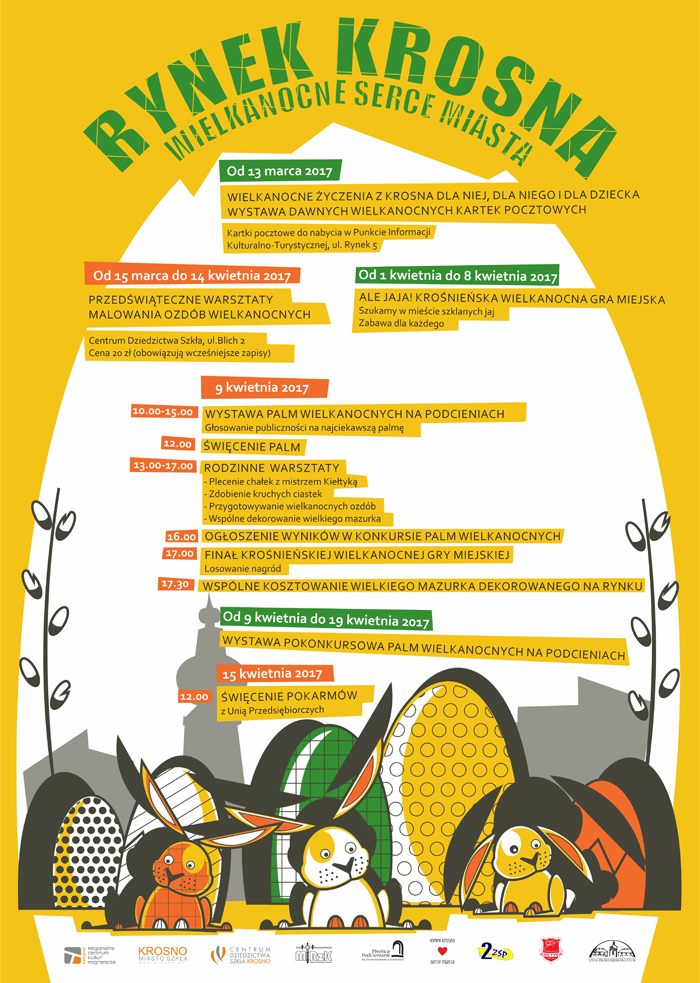 „Ale jaja!”Przez tydzień, zaczynając od 1 kwietnia, gramy w Krośnie w „Ale jaja”! Na wyznaczonym w centrum miasta obszarze ukryto 13 szklanych jaj. Jeśli zobaczysz takie jajo, zrób mu zdjęcie. Aby stać się uczestnikiem krośnieńskiej wielkanocnej gry miejskiej wystarczy, że uda Ci się odszukać i sfotografować 8 szklanych jaj. Wyślij zdjęcia na adres alejaja@miastoszkla.pl i czekaj na swoją nagrodę pod wielkanocną palmą na krośnieńskim Rynku 9 kwietnia. Więcej na Facebooku (informacje będą się pojawiały też na innych profilach, np. facebook.com/miastokrosno).
