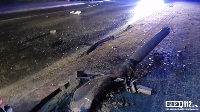 Do niebezpiecznego zdarzenia doszło około 15 minut po godz 3:00 na ul. Wieniawskiego w Krośnie. Kierowca osobowego Seata, jadąc od strony ul. Sikorskiego, stracił panowanie nad pojazdem i uderzył w słup oświetleniowy, a następnie wjechał w ogrodzenie pobliskiej piekarni. Samochód stanął w płomieniach, a latarnia została dosłownie ścięta.