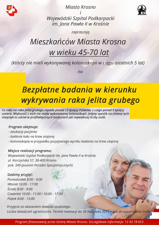 W Wojewódzkim Szpitalu Podkarpackim im. Jana Pawła II w Krośnie można skorzystać z bezpłatnych badań w kierunku wykrywania raka jelita grubego. Program skierowany jest do mieszkańców Krosna, w wieku 45-70 lat (po okazaniu dowodu osobistego), którzy nie mieli wykonywanej kolonoskopii w ciągu ostatnich 5 lat oraz nie leczą się na raka jelita grubego.