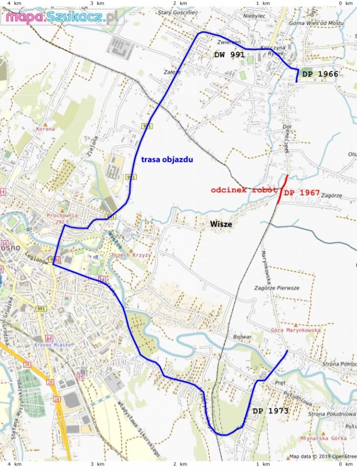 Od 13 lutego do 20 marca 2020 r., w godzinach od 8.00 do 17.00 zamknięty dla ruchu będzie odcinek rozpoczynający się bezpośrednio przed zwężeniem drogi na moście, w km 1+175 (przy potoku Burkot), który biegnie przez skrzyżowanie z ul. Wisze (o nawierzchni betonowej) i kończy się na skrzyżowaniu z drogą gminną Nr 114844R (ul. Zagórze), w km ok. 1+530.