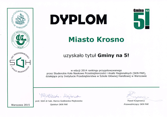 Krosno ponownie otrzymało wyróżnienie „Gmina na 5!”, co świadczy o bardzo dobrej obsłudze potencjalnych inwestorów w dłuższej perspektywie czasowej. Krosno znalazło się wśród nagrodzonych gmin już po raz trzeci z rzędu, dlatego zostało uhonorowane wyróżnieniem specjalnym „Złota Gmina na 5!”