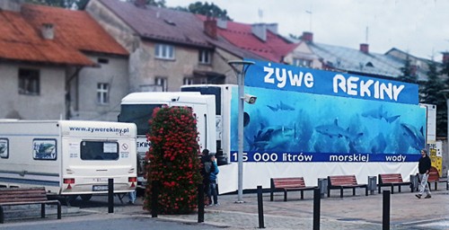 Rekiny przebywają w największym w Europie mobilnym akwarium, zamontowanym w naczepie TIR-a. Nad akwarium znajduje się laboratorium, w którym czuwa się nad niełatwą technologią utrzymania równowagi i stabilności środowiska niezbędnego dla życia rekinów. Jego pojemność to 15 tysięcy litrów wody morskiej.