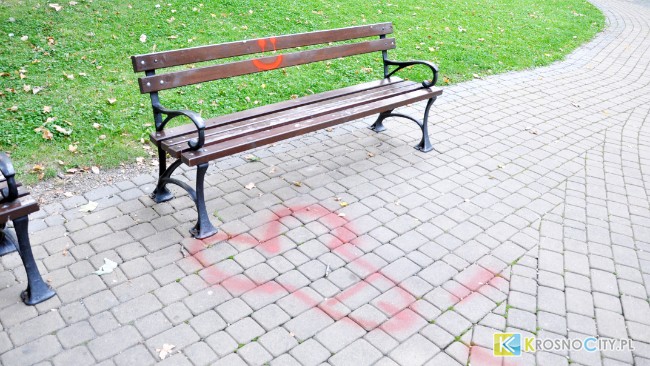 Teraz w parku ktoś wysmarował napisy i rysunki na kostce brukowej i ławce.
