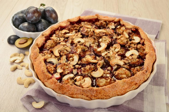 Składniki:– mąka – 300 gramów,- Kostka do pieczenia Kasia – 150 gramów,- cukier trzcinowy – 50 gramów,- żółtka jajek – 3 sztuki,- białko jajka – 1 sztuka,- śliwki – 600 gramów,- cukier żelujący 3:1 – 150 gramów,- orzechy nerkowca – 200 gramów,- bułka tarta – 3 łyżki,- cukier trzcinowy – 1 łyżka.