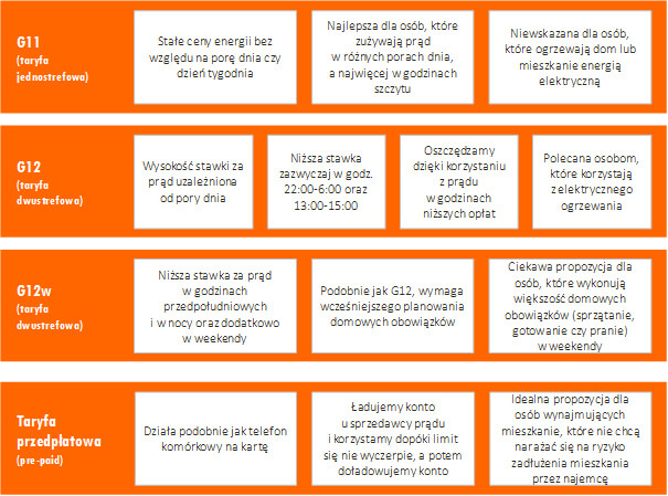 Z kolei wśród taryf dwustrefowych, klienci mogą wybierać między G12, a G12w. Opłaty za prąd są w nich niższe w godzinach 22:00-6:00 i 13:00-15:00, a w taryfie G12w dodatkowo również w weekendy. Jest to idealna propozycja dla osób, które pracują w domu i mogą część prac wykonywać przed południem lub też zaprogramować niektóre urządzenia, by włączały się w godzinach tańszych opłat za energię (np. ogrzewanie elektryczne). Z kolei tańsza energia elektryczna w weekendy to ciekawa oferta dla osób wykonujących prace domowe w dni wolne, kiedy zazwyczaj więcej czasu spędzamy w domu.