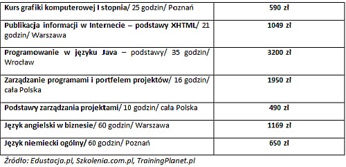 Inną alternatywą mogą okazać się kursy unijne, jednak aby wziąć w nich udział należy spełniać szczegółowe kryteria, np. projekt kształcący Project Managerów IT preferuje pracowników branży, którzy ukończyli 45 lat oraz kobiety. Pozostaje oczywiście jeszcze bogata baza szkoleń płatnych, a skoro Urzędy Pracy ani pracodawcy nie są chętni lub nie mają możliwości sfinansowania naszej edukacji, kształcenie ustawiczne może stać w miejscu. Tym bardziej, że deklarowana przez Polaków „rozsądna” kwota za 1 dzień szkolenia wynosi od 20 do 49 zł. A taki wydatek nie wystarczyłby w większości przypadków nawet na godzinę kursu. Tak bowiem przedstawiają się ceny szkoleń w popularnych dziedzinach: