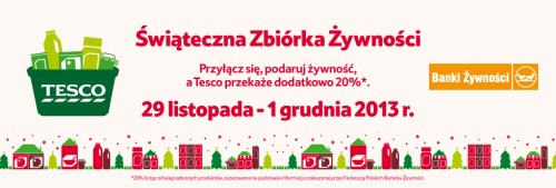 Rusza Świąteczna Zbiórka Żywności. Banki Żywności oraz Tesco zapraszają wszystkich Klientów sieci, aby w ten przedświąteczny czas, razem z nimi pomogli osobom potrzebującym. Świąteczna Zbiórka Żywności odbędzie się w dniach od 29 listopada do 1 grudnia. Szczodrość wszystkich darczyńców ma w tym roku duże znaczenie, gdyż do całej zebranej puli produktów, Tesco dokłada na ten cel dodatkowe 20% żywności.