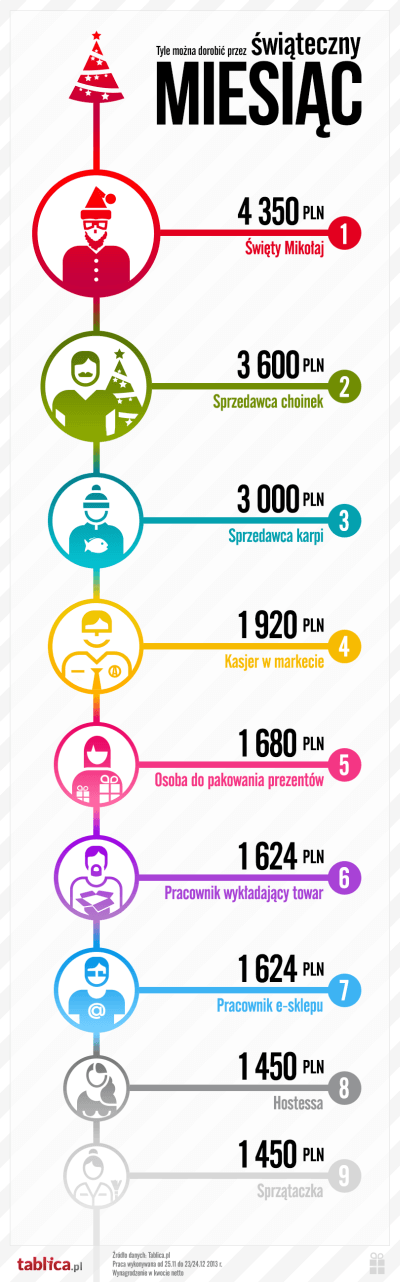 Kto po miesiącu pracy będzie się cieszył największym wynagrodzeniem? Jak wynika z analizy serwisu Tablica.pl, numerem jeden wśród najlepiej opłacanych „świątecznych zawodów” jest posada Świętego Mikołaja, który pracując w centrum handlowym i zaliczając kilka domowych wizyt w Wigilię, może zarobić średnio 4 350 zł netto. Równie opłacalnym zajęciem jest sprzedaż choinek i karpi, gdzie miesięczne wynagrodzenie szacuje się na odpowiednio 3 600 zł i 3 000 zł netto.