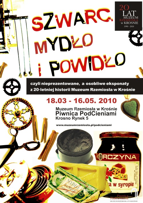 Tytuł wystawy Szwarc, mydło i powidło jest poniekąd wizerunkiem zbiorów Muzeum Rzemiosła, można by go bardziej elegancko nazwać z francuska bric-á-brac. Poza tym, że wystawa pokazuje magazynowe zbiory trochę „od Sasa do Lasa” tytuł można traktować dosłownie. Cóż to jest szwarc – inaczej szuwaks, ot po prostu pomada do butów inaczej pasta, jak najbardziej związana z obszarem zbiorów muzeum. Czymże bowiem szewc kończył swoją pracę? Oddaniem gotowych butów uczniowi lub czeladnikowi do szwarcowania.