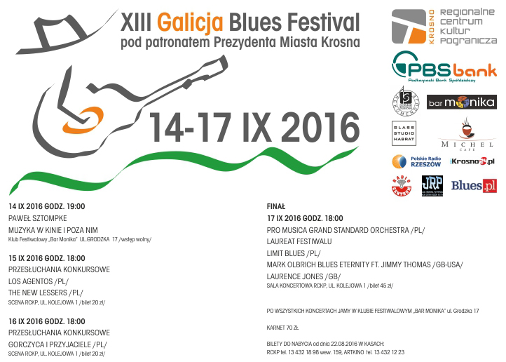 Zgodnie z tradycją finałowy koncert Galicja Blues Festival otworzy Pro Musica Grand Standard Orchestra, którą tworzą uczniowie i nauczyciele Szkoły Muzycznej I i II stopnia PRO MUSICA w Krośnie. Zespół w swoim repertuarze posiada arcydzieła muzyki poważnej, filmowej, jazzu, soulu, rocka oraz bluesa. Dość nietypowy skład orkiestry – brak grupy perkusyjnej – powoduje potrzebę przeinstrumentowania swingujących rytmów na smyczki, fortepian i „dęciaki”, a wszystko po to, by słuchacz mógł poczuć bluesa! Po występie orkiestry nastąpi ogłoszenie wyników i scena zostanie zadysponowana dla laureata Galicja Blues Festival. Dalej będzie już tylko ciekawiej. Stanie się tak za sprawą Limit Blues, którego protoplastą był amatorski zespół „Limit” założony w 1983 roku przez trzech kieleckich licealistów, który po sześciu miesiącach zawiesił bezterminowo swoją działalność. W 2012 roku jeden z założycieli dawnego Limitu – Paweł Wawrzeńczyk – reaktywował zespół, który w ciągu dwóch lat przygotował materiał i wydał dwa albumy z własnymi kompozycjami: „1983-2012” i „Co dalej”. Aktualnie grupa pracuje nad drugim albumem studyjnym, który ukaże się jesienią 2016 r. Limit Blues nie jest jedyną gwiazdą finałowej gali. Pojawi się na niej Mark Olbrich z zespołem Blues Eternity. Basista jest jednym z najbardziej cenionych brytyjskich muzyków bluesowych i… posiada polskie korzenie.