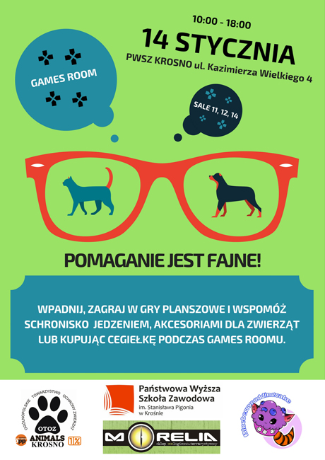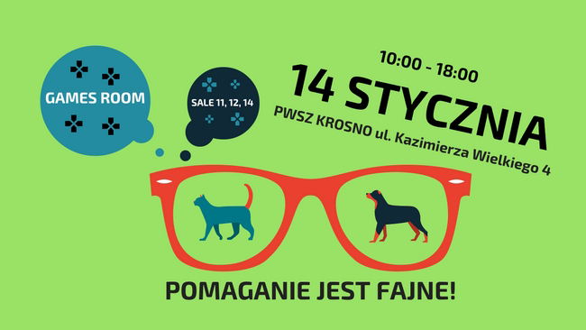 Blueberrypuddingcake, PWSZ w Krośnie oraz OTOZ Animals Krosno wspólnie organizują games room, podczas którego będzie okazja do zagrania w gry planszowe oraz wsparcie przytuliska dla psów i kociarni.