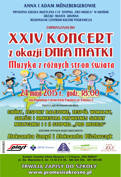 Prywatna Szkoła Muzyczna I i II stopnia Pro Musica w Krośnie Anny i Adama Münzbergerów już po raz 24. zaprasza na koncert z okazji Dnia Matki. Wydarzenie pt. "Muzyka z różnych stron świata" odbędzie się 24 maja o godz. 18.00 w sali Regionalnego Centrum Kultur Pogranicza w Krośnie (ul. Kolejowa 1).