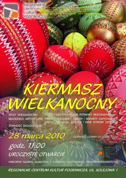 Na stołach wielkanocnych znajdą się tradycyjne świateczne potrawy regionalne. Rekodzieło artystyczne zaprezentuje pisanki, kraszanki, obrusy i serwety haftowane, stroiki, ceramikę, koszyki. Można będzie również podziwiać zgłoszone na konkurs palmy wielkanocne.