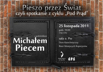 Na kolejne spotknie z podróżnikami z cykul „pod prąd” zapraszamy w piątek, 25 listopada 2011, godzina 19:00, sala o. Pio Domu Katechetycznego przy klasztorze Braci Mniejszych Kapucynów w Krośnie. Organizator: GPS oraz Bracia Mniejsi Kapucyni.