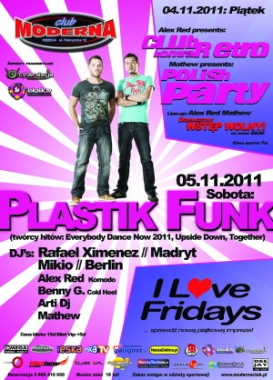 Na to fani "ibizowkich" klimatów czekali już od roku. Już 5 listopada w klubie Moderna zagra formacja PLASTIK FUNK !!! Twórcy takich hitów jak "Everybody Dance Now 2011", "Upside Down", "Together" na stałe goszczący w najlepszych klubach świata, jedni z najbardziej prestiżowych remixerów świata tym razem w Modernie pojawią się w pełnym składzie.