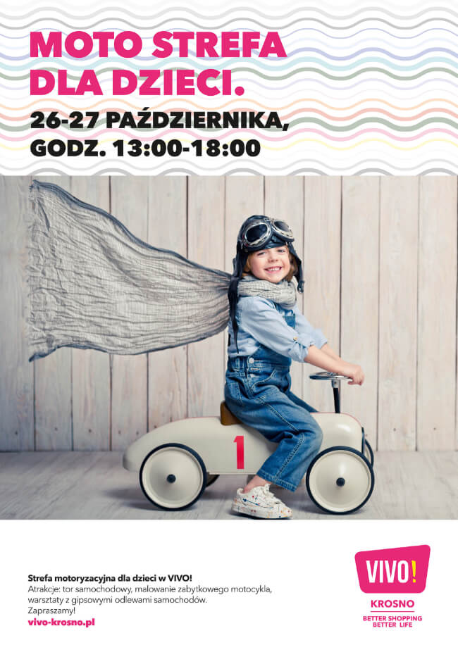 Już wkrótce w VIVO! Krosno najmłodsi po raz kolejny będą mieli szansę sprawdzenia się w rolach kierowców mini aut. W dniach 26-27 października w Centrum Handlowym wyznaczona zostanie specjalna Moto Strefa, w której dzieci zasiądą za kierownicami małych samochodów. Dodatkowo dla dzieci zorganizowane zostaną tematyczne warsztaty plastyczne, podczas których pomalują… zabytkowy motocykl!