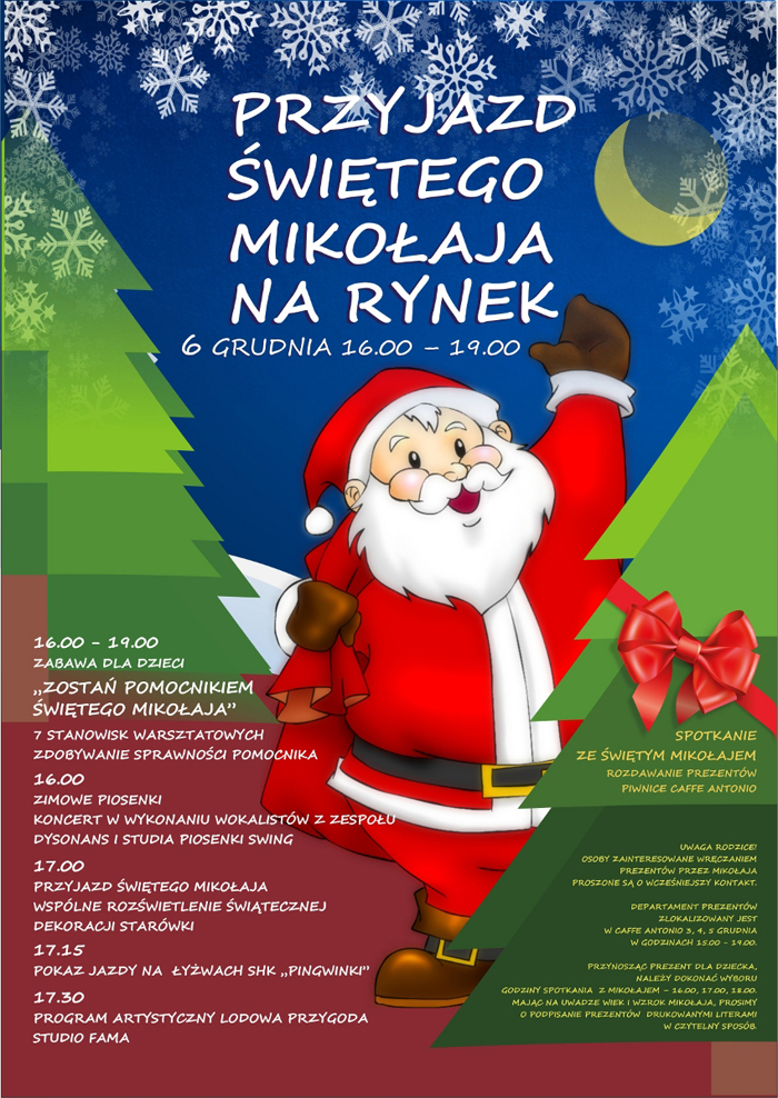 Spotkanie ze Świętym Mikołajem odbędzie się w Piwnicach Caffe Antonio. Osoby zainteresowane wręczeniem prezentów przez Mikołaja proszone są o wcześniejszy kontakt. Departament prezentów jest zlokalizowany w Caffe Antonio 3, 4 i 5 grudnia w godzinach od 15:00 do 19:00. Przynosząc prezenty dla dziecka, należy dokonać wyboru godziny spotkania z Mikołajem (16:00, 17:00, 18:00) Mając na uwadze wiek i wzrok Mikołaja prezenty należy podpisać w czytelny sposób, najlepiej drukowanymi literami.