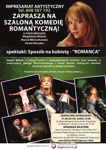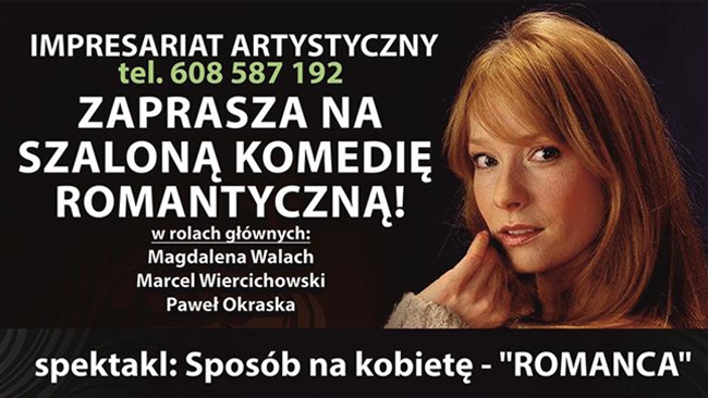 Spektakl pt. Sposób na kobietę. „Romanca” to sztuka bliska człowieka i jego codziennych problemów, bo czy nie zdarzyło się, że życie przybiło Cię do ziemi i nie umiałeś podnieść? Jedynym wyzwoleniem może okazać się wtedy wędrówka w poszukiwaniu ukojenia, do świata piękna… Czy ratunkiem okaże się kobieta, miłość, sztuka, a może prawda, prawda o sobie samym…?