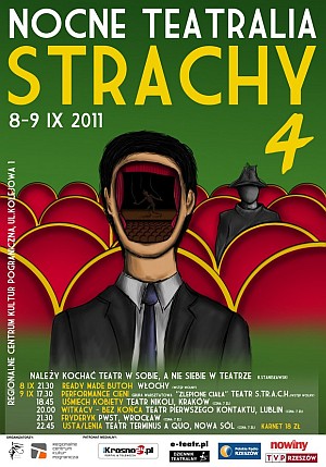 Ponoć do trzech razy sztuka, jednak my łamiemy tę zasadę i przekornie zapraszamy do udziału w IV Międzynarodowych Nocnych Teatraliach Strachy. Podczas czwartej edycji chcielibyśmy prosić Teatry o pomoc w krzewieniu miłości do teatru wśród widzów Nocnych Teatraliów Strachy. Mamy nadzieję, że i w tym roku spektakle przeniosą nas w inny wymiar, w którym nawet powietrze nie jest takie samo. Jesteśmy przekonani, że poprzez spektakle, pomysły na uprawianie teatru, osobowości, ekspresję jesteśmy w stanie sprostać temu trudnemu zadaniu. Do IV edycji Nocnych Teatraliów Strachy zakwalifikowaliśmy następujące teatry: Teatr Pierwszego Kontaktu z Lublina, Teatr Nikoli z Krakowa, Teatr Terminus A Quo z Zielonej Góry oraz studentów PWST Wrocław. Teatr s.tr.a.c.h. Wraz z grupą warsztatową Zlepione Ciała przeniesie widza w magiczną krainę cieni. Gościem tegorocznej edycji będzie włoski artysta Bruno Freddi wraz z teatrem.