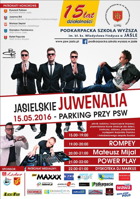 Z okazji 15-lecia Podkarpackiej Szkoły Wyższej w Jaśle, studenci mogą liczyć na wyjątkową imprezę. 15 maja na jasielskich Juwenaliach zagrają Rompey, Mateusz Mijal oraz gość specjalny, zespoł Power Play. Na zakończenie studenckiej imprezy zaplanowano dyskotekę, którą poprowadzi Dj Markus.